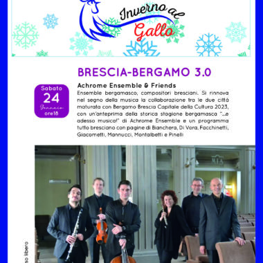 Per la rassegna Brescia-Bergamo 3.0, sabato alle ore 18 l’ensemble Achrome eseguirà presso la Cascina Parco Gallo il duo di Giacometti per violoncello e pianoforte “Canto d’amore dai confini del mondo”, brano commissionato dal festival Pianistico Internazionale di Brescia e Bergamo nel 1998, ma eseguito durante il Festival di due anni dopo, nel 2000.