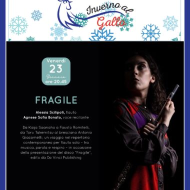 Venerdì 23 gennaio, alle ore 20.45 presso la sala dei concerti della Cascina Parco Gallo a Brescia, Alessia Scilipoti presenta in concerto il suo CD di esordio come solista, “Fragile”. Nell’occasione verrà eseguito anche “Der Umriss”, il brano di Giacometti del 1984, commissionato dalla grande e compianta flautista italiana Annamaria Morini.